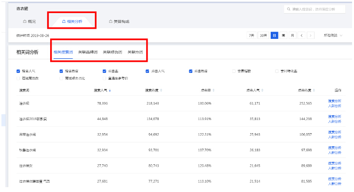 根据以上方式找到高流量词后,重点选择其中的几个关键词就行(根据自己的预算,不要放太多的词,否则预算太高,承受不住,并且要保证每个词都有足够的点击量)。以女装连衣裙蕾丝为例,打开直通车—选择工具—点击流量解析--查询—点击竞争流量透视,