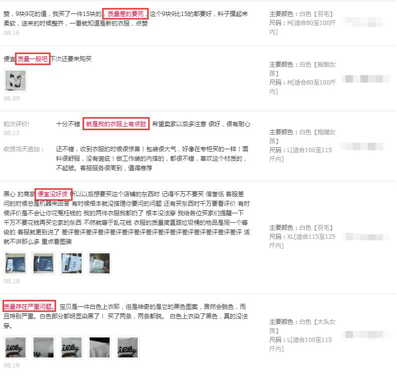 比如这个T恤,大家在打开后,可以去重点关注一下中评和差评,你就可以发现评论当中会有很多的关键词:如存在严重的质量问题、买的东西有差距、衣服上很脏。