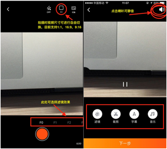 另外拍摄可以自由切换视频尺寸及选择滤镜。拍完可以剪辑页面。